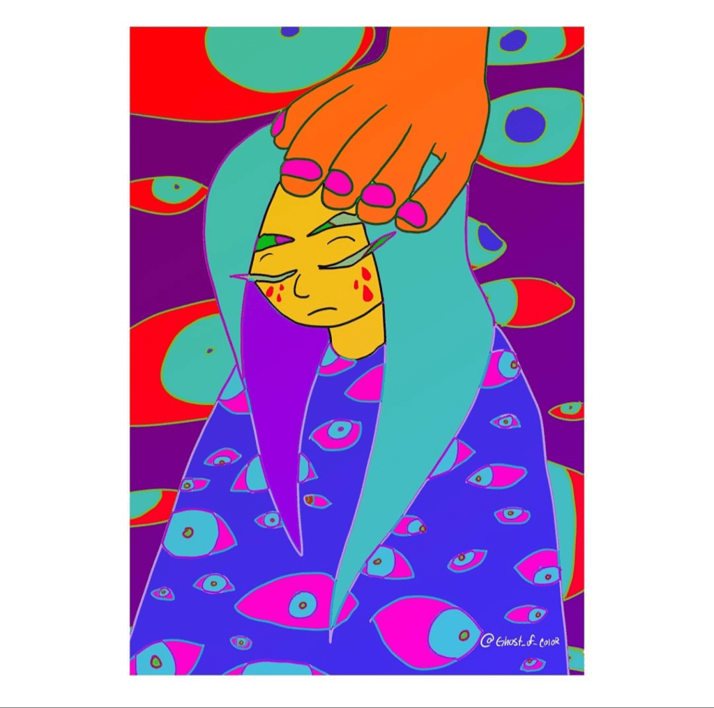 I usually get asked why I portray pain and suffering with bright colors. Its because bright colors literally hurt me when I look at them. These colors visually clash and give me the feeling of burns, they make my eyes water. But I keep looking at them until I see after images when I look away, literal ghosts of color.